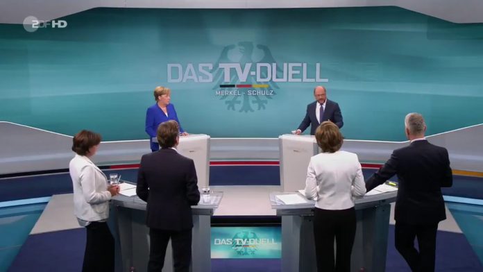 Almanya’da 24 Eylül’de yapılacak genel seçimlere üç hafta kala Hristiyan Demokrat Birlik (CDU) lideri ve Başbakan Angela Merkel ile Sosyal Demokrat Parti (SPD) Genel Başkanı ve başbakan adayı Martin Schulz, pazar akşamı dört televizyon kanalında canlı yayınlanan tartışma programında karşı karşıya geldi.ARD, ZDF, RTL ve SAT1 kanallarından eş zamanlı olarak yayınlanan televizyon düellosunda iki lider iç ve dış siyasete ilişkin konularda seçmene görüşlerini anlatmaya çalıştı. Liderler SAT1’den Claus Strunz, ARD’den Sandra Maischberger, ZDF’ten Maybrit Illner ve RTL’den Peter Kloeppel’in sorularını yanıtladı. Merkel ve Schulz’un düellosunda Türkiye sık sık gündeme geldi.