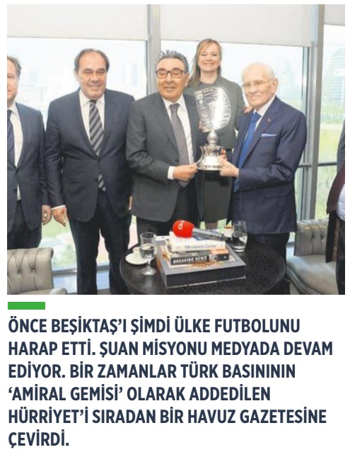 Demirören koltuğunu kime borçlu olduğunu zaten açıklamasında belirtmiş. ‘Yedi yıl boyunca Türkiye Futbol Federasyonu Başkanlığı görevimde başta Sayın Cumhurbaşkanımız Sayın Recep Tayyip Erdoğan’a desteklerinden ve güveninden dolayı teşekkür ediyorum.’ Saray’daki zat memnunsa gerisi teferruattır. Hani Demirörenler de ailecek Saray’ı memnun etmek için az gayret göstermedi. Telefonda yediği azar sonrası hüngür hüngür ağlayan baba Erdoğan Demirören, hatasını Doğan Medya’yı satın alıp Saray’ın emrine sunarak telafi etti. Gerçi parayı Ziraat Bankası verdi ama sonuçta kağıt üzerinde sahibi Demirören grubuydu.