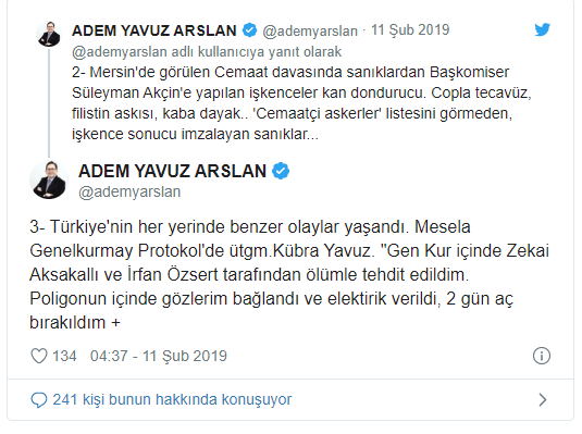 2- Mersin’de görülen Cemaat davasında sanıklardan Başkomiser Süleyman Akçin’e yapılan işkenceler kan dondurucu. Copla tecavüz, filistin askısı, kaba dayak.. ‘Cemaatçi askerler’ listesini görmeden, işkence sonucu imzalayan sanıklar…