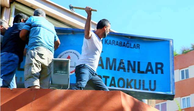 Daha Fazla OkuAdıyaman’da Hizmet Hareketi’ne yakın vakfa ait olan ve kapatılan özel okulun tabelası itfaiye erleri tarafından tekbirlerle indirilip, balyozla parçalandı....